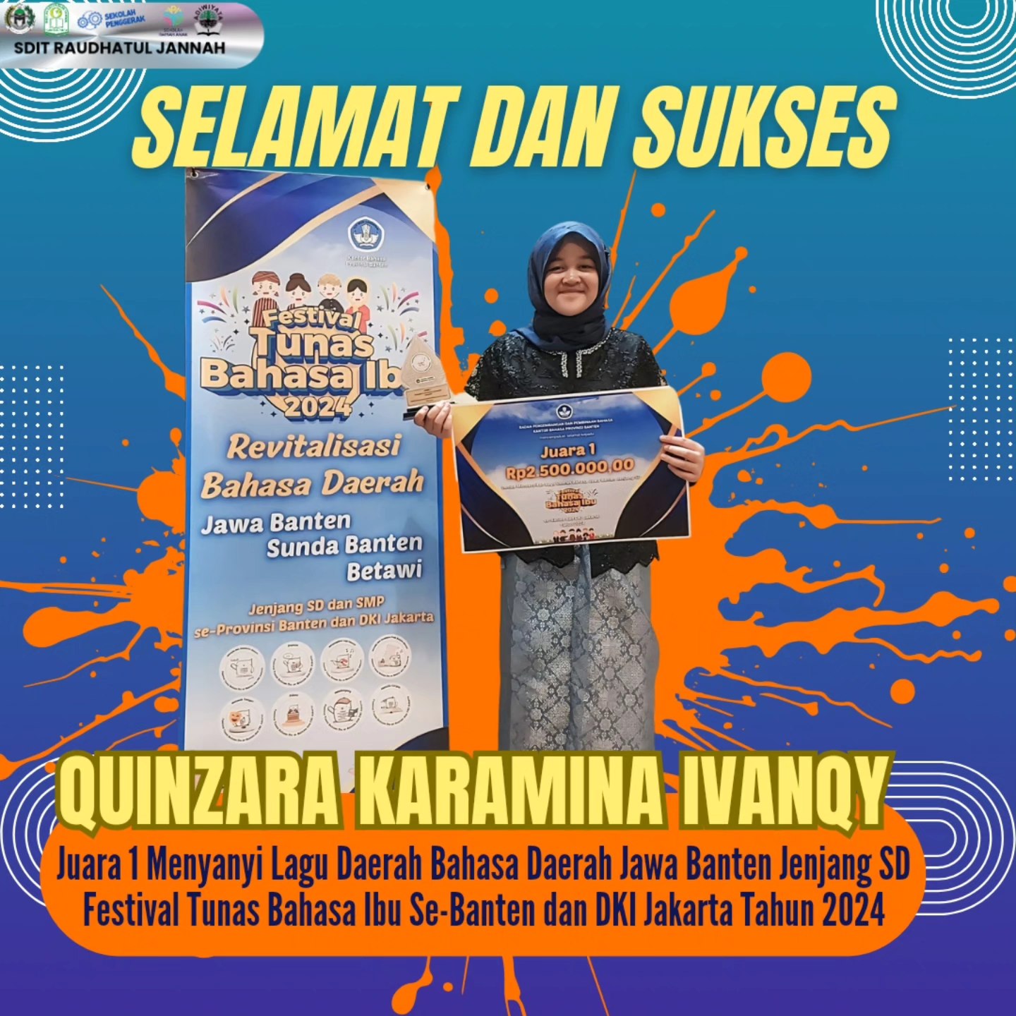 Alhamdulillahirabil'alamin peserta didik SDIT Raudhatul Jannah berhasil meraih prestasi Juara 1 Lomba Menyanyi Lagu Bahasa Daerah Jawa Banten Jenjang SD pada Festival Tunas Bahasa Ibu Se-Banten dan DKI Jakarta Tahun 2024.